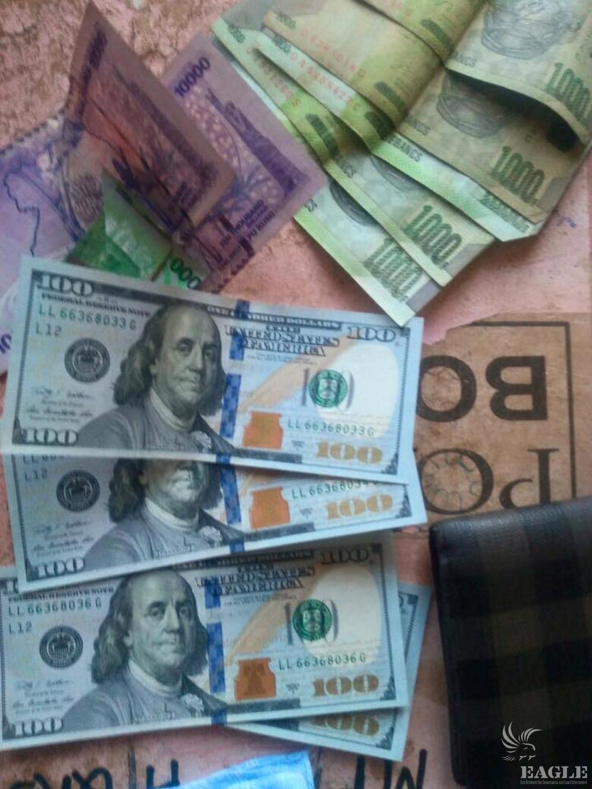 Besides ivory, a sash of US$ 400, 25,000 of Uganda shillings and 5,000 of Congolese Francs and a driving permit from the Democratic Republic of Congo were found with them.