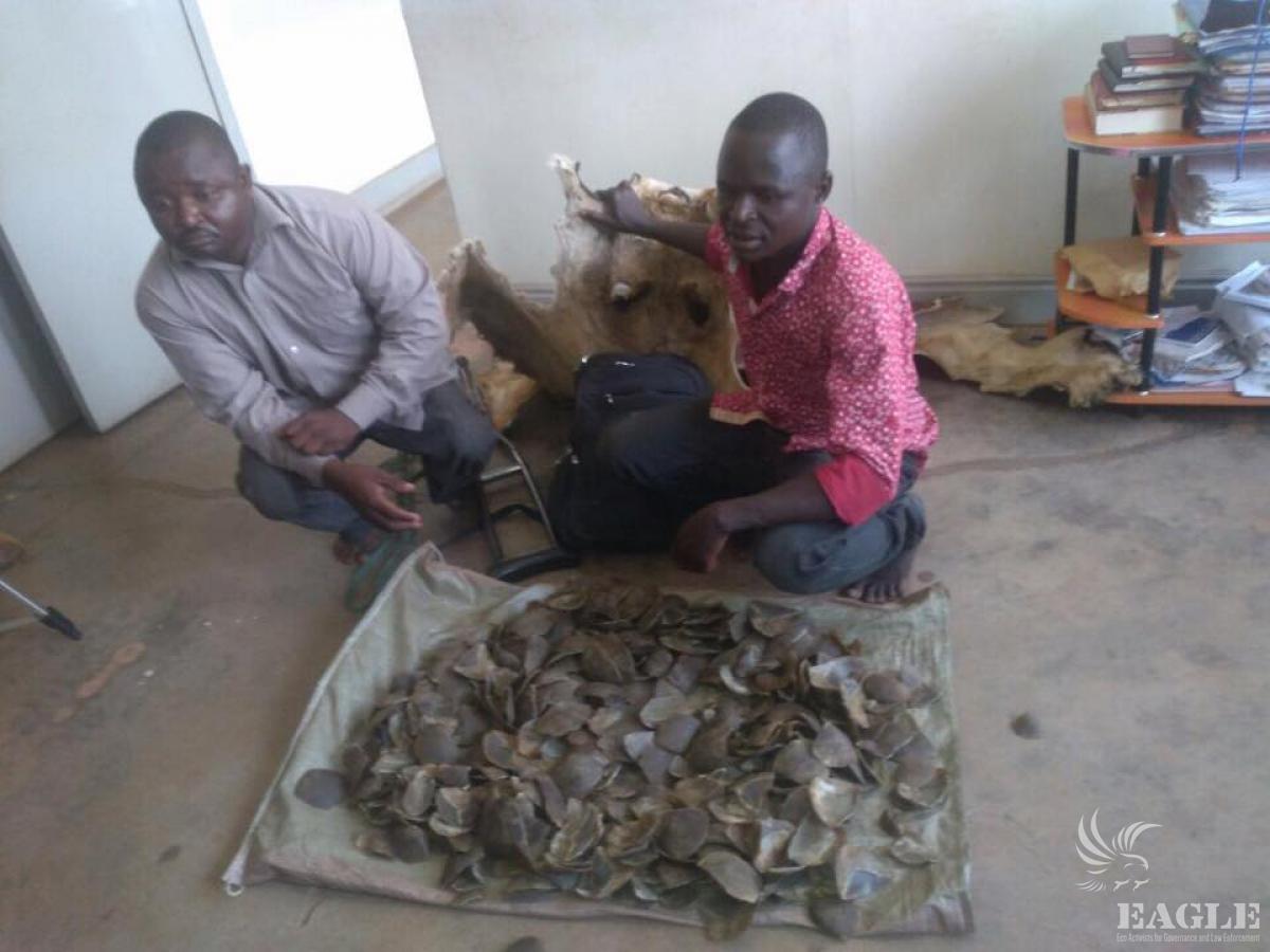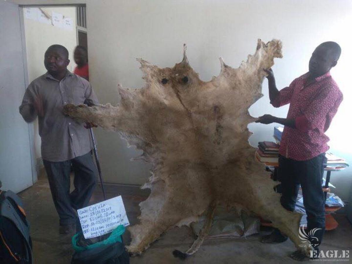 2 traffickers arrested in the capital city with a lion's skin and 12kg of pangolin scales. One of them is a police constable while the other one is an owner of a company. The company owner has been involved in trafficking including ivory for a long time. The lion skin was trafficked from northern Kenya.